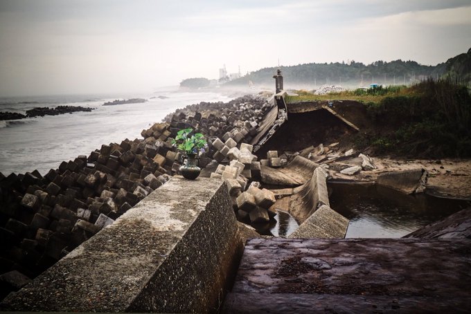 華道家片桐功敦の「再生のいけばな」。先の講演でも感動したが、大きなパネルで見ると改めて圧倒される。この花たちが他の被災地写真と違う力を持つのは、それが過去と今とをつないでいる気がたしかにするからだろう。音符のようにポロポロと、ピアノから咲きこぼれる花。 https://pic.twitter.com/HrPq2XKiSA見渡す限り泥の、無の平野となってしまった場所にぽっと咲くヘルメットやスニーカーの花。力に抗えず断ち切れた堤防に、話しかけるように佇む花瓶の花。