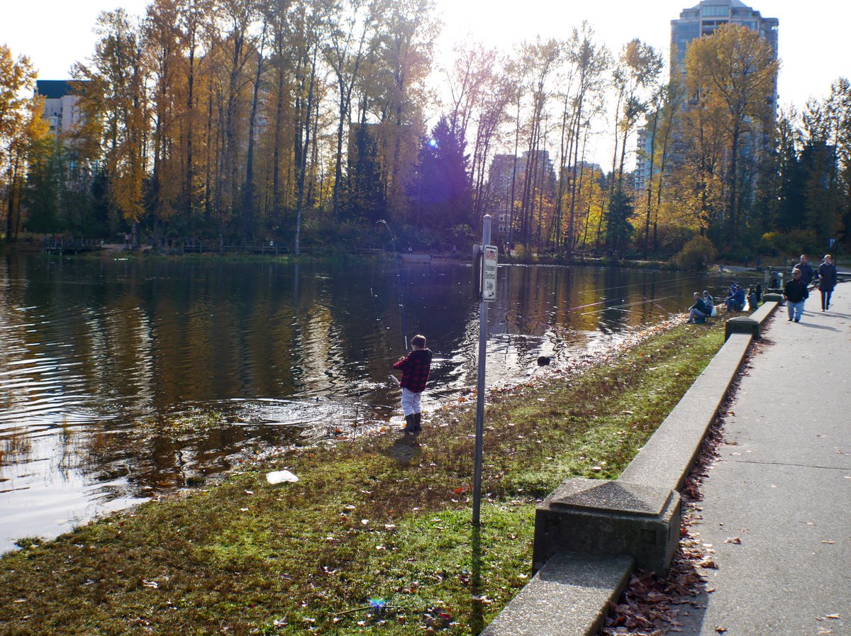 【サンデー】奥様と帰国後初の散歩。先週は帰国直後でエネルギーなく行けなかった。隣町の公園の池にはマスが放たれてるそうで、子供らとアジアおじさんがずらりと並ぶ釣り堀になっていた。はは、竿林立。